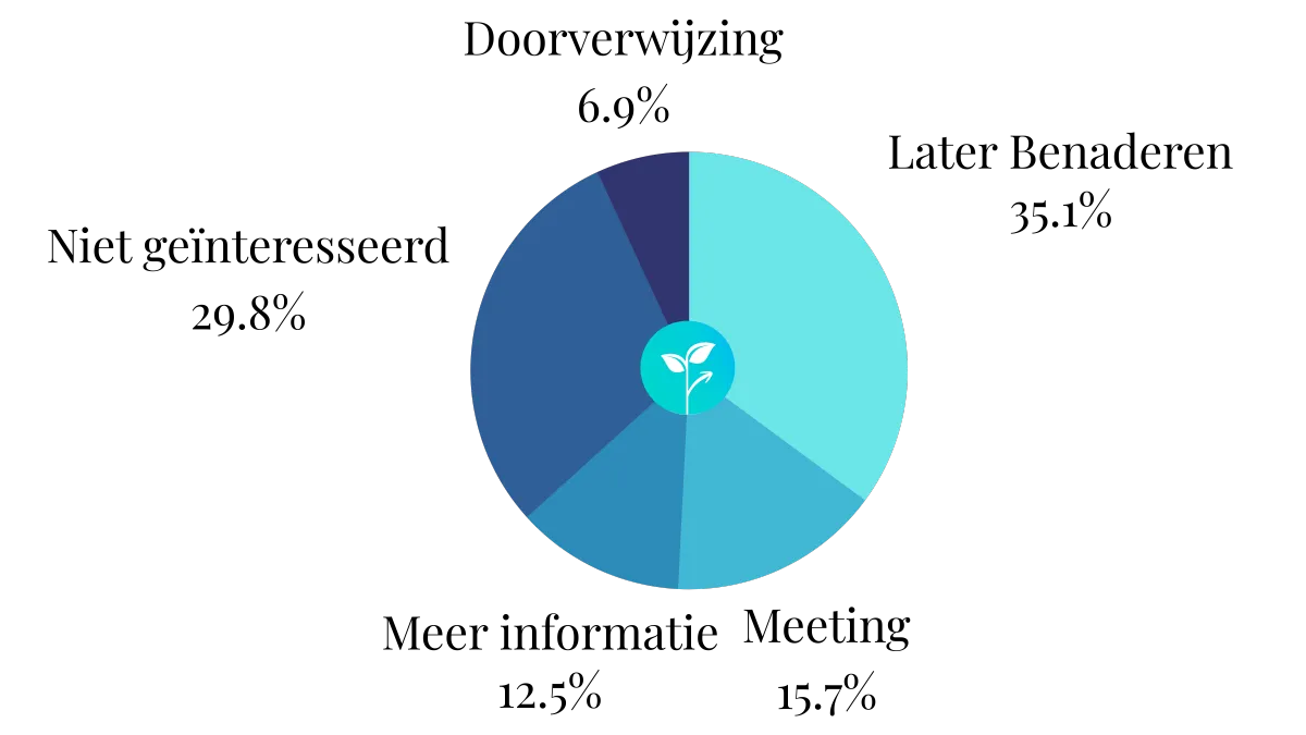In de verdeling zie je hoe leads zich ontwikkelen: een groot deel vraagt om later contact, een deel plant direct een meeting, anderen willen eerst extra informatie. Ook “niet geïnteresseerd” is waardevol, omdat het je funnel schoon houdt en de focus legt op kansen met groeipotentieel.