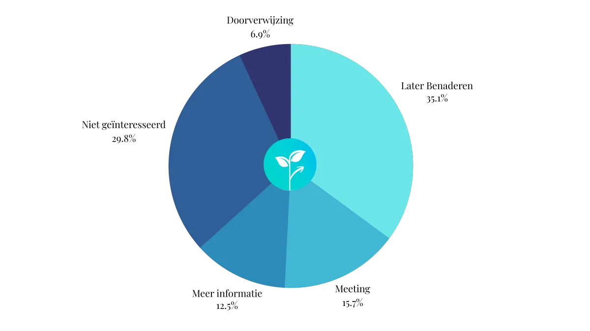 In de verdeling zie je hoe leads zich ontwikkelen: een groot deel vraagt om later contact, een deel plant direct een meeting, anderen willen eerst extra informatie. Ook “niet geïnteresseerd” is waardevol, omdat het je funnel schoon houdt en de focus legt op kansen met groeipotentieel.